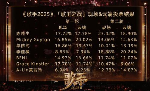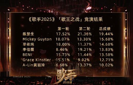 紧张激烈的比拼过后,《歌手 2025》最终结果也随之出炉——第 1 名陈楚生、第 2 名米奇 · 盖顿、第 3 名单依纯、第 4 名李佳薇 、第 5 名 BENI、第 6 名格瑞丝 · 金斯勒、第 7 名黄丽玲。陈楚生笑到了最后,最终成为年度歌王。