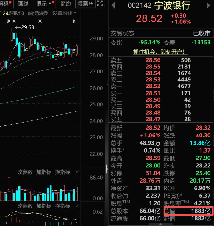 数据显示,截至2025年9月1日,宁波银行股价2025年累计涨幅为21.83%,排在银行板块中第五位;城商行中,仅次于比自己体量小非常多的青岛银行。最新市值1883亿元,排在城商行中第二位,与第一的江苏银行总市值仅相差84亿元。