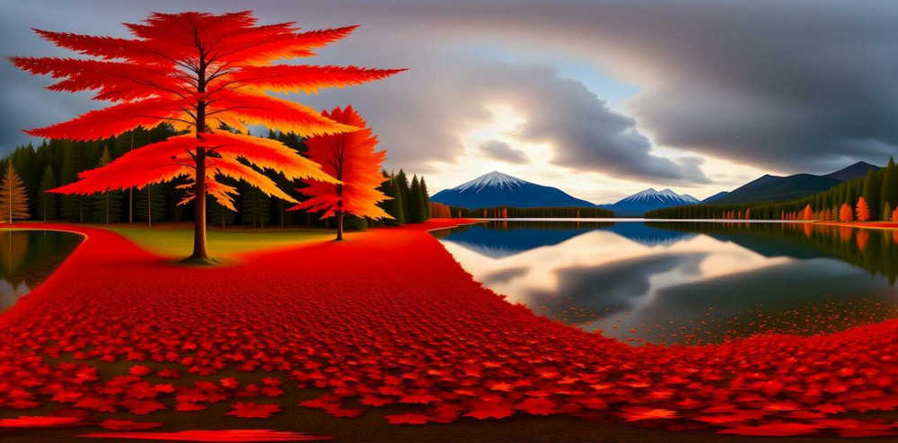 若输入「金红色的枫叶飘落在镜面般的湖水上,倒映着远处的雪山」,一张包括雪山、湖水、枫叶元素的效果图就出来了: