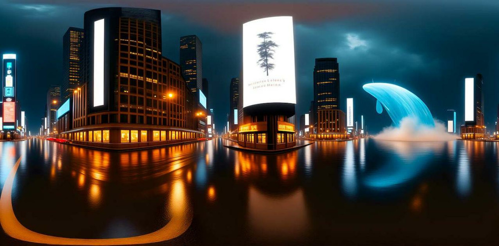 DoNews记者尝试体验了一把,比如输入「全息广告牌映照着湿漉漉的街道,远处巨大的数字鲸鱼在游动」, 就会生成如下效果如。无论是作为主体的广告牌、鲸鱼,还是周围的光线、环境等元素,构筑得都较为完整。